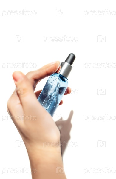 Крупный план женской руки с прозрачным флаконом синей увлажняющей сыворотки для лица. Молодая женщина держит косметический продукт. Витаминная антивозрастная эссенция для кожи на белом изолированном фоне