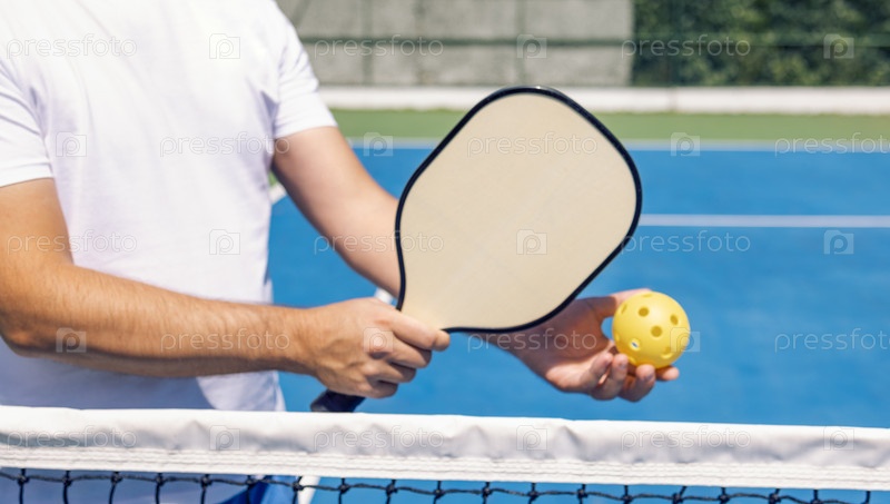 Крупный план мужской руки, держащей ракетку для пиклбола и желтый мяч с отверстиями. Мужчина в белой футболке играет на открытой игровой площадке. Энергичная спортивная игра в солнечный день