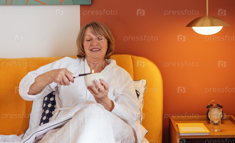 Пожилая женщина в белом халате лежит в постели и зажигает ароматическую свечу. Зрелая дама улыбается и отдыхает в спальне