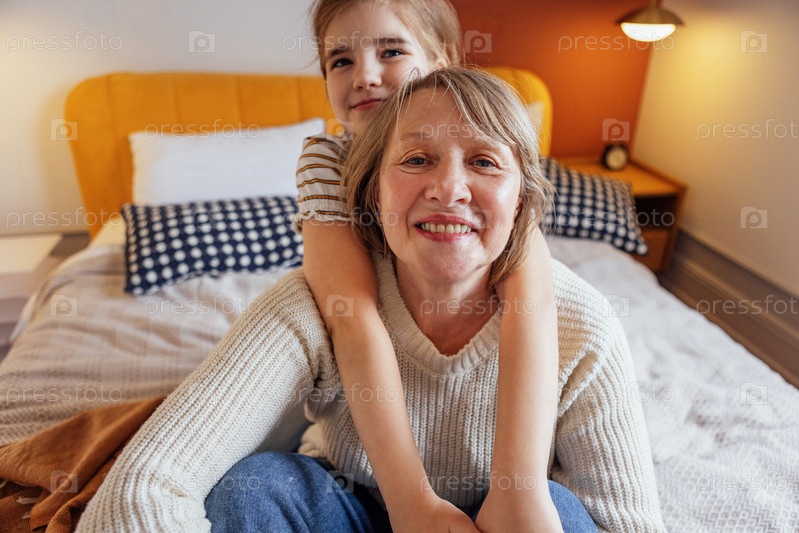 Пожилая женщина и ее внучка обнимаются и сидят на кровати. Маленькая девочка и ее бабушка улыбаются и расслабляются. Зрелая дама и ребенок в повседневной одежде веселятся вместе