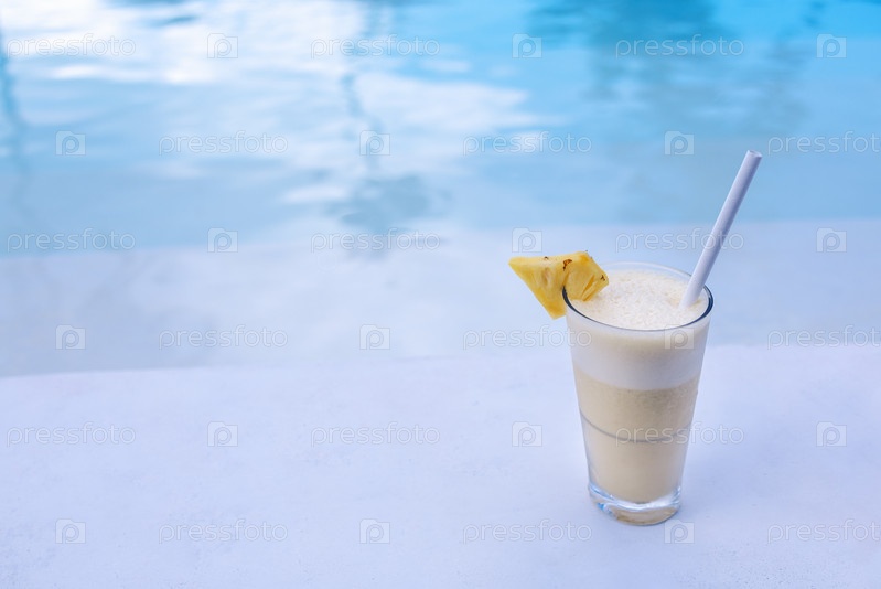 Крупный план вкусного коктейля на краю бассейна. Стакан с прохладным напитком и кусочек ананаса у прозрачной голубой воды