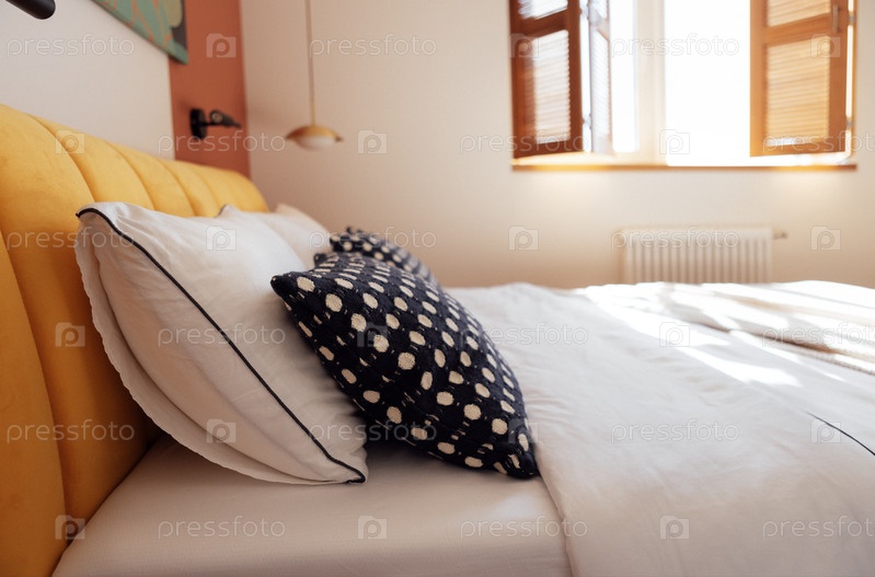 Крупный план контрастных наволочек на уютной большой кровати в спальне. Современный стильный интерьер комнаты с яркими деталями