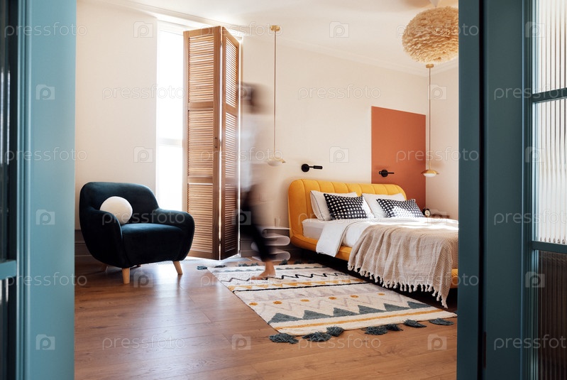 Уютная спальня с белыми стенами. Открытая стильная синяя дверь. Кровать с изящными прикроватными тумбочками. Силуэт человека, выходящего через деревянные жалюзийные двери
