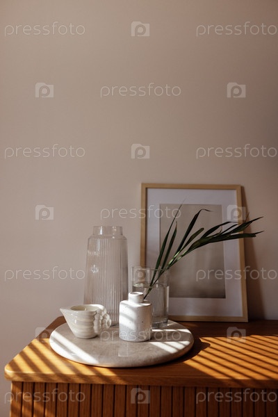 Крупный план эстетических деталей интерьера дома. Керамический поднос на деревянном комоде в спальне