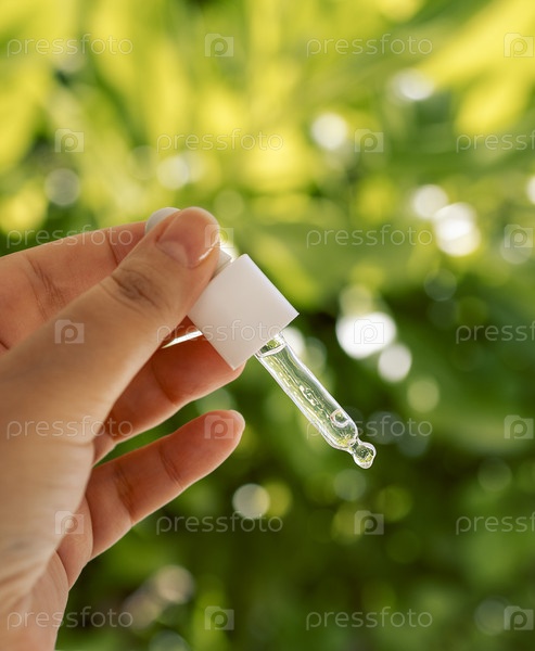 Крупный план женской руки с капельницей и увлажняющей сывороткой для лица. Молодая женщина держит косметический продукт. Прозрачная витаминная эссенция для кожи