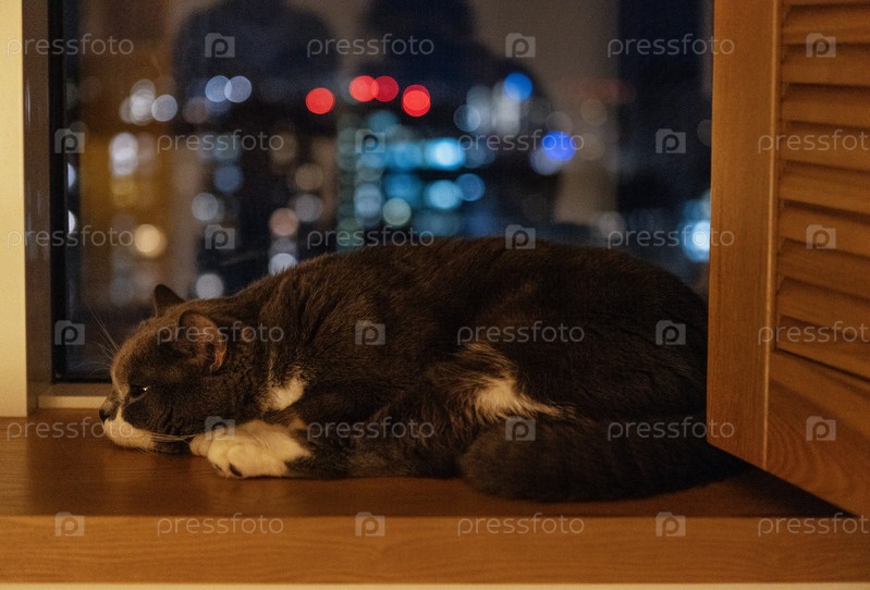 Крупный план милого пушистого серого кота, спящего на деревянном подоконнике. Милый питомец лежит на окне квартиры. На заднем плане огни города