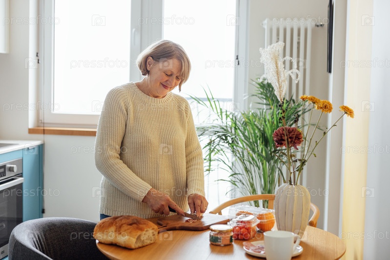 Пожилая женщина в повседневной одежде готовит завтрак на кухне. Зрелая дама режет колбасу и хлеб дома в столовой. Пенсионерка готовит бутерброды на обед