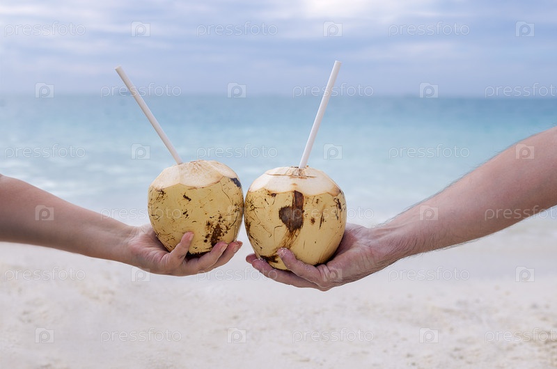 Две руки с кокосами с соломинками на берегу океана. Мужчина и женщина держат вкусные натуральные коктейли на фоне чистой голубой морской воды. Морской пейзаж и тропические напитки