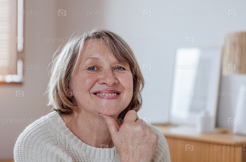 Портрет крупным планом пожилой женщины в свитере. Красивая дама средних лет в повседневной одежде улыбается в гостиной. Пенсионерка позирует дома