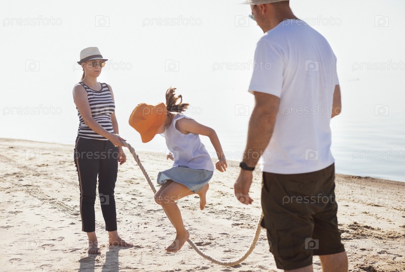 Мама и папа держат канат, их дочь прыгает через него. Молодая супружеская пара развлекается с ребенком у моря