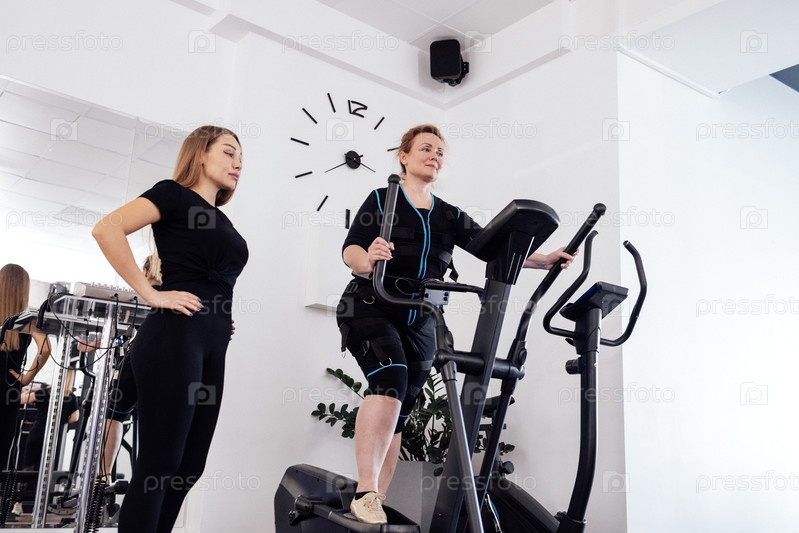 Пожилая женщина в костюме для электростимуляции мышц тренируется на эллиптическом тренажере со своим персональным тренером в спортзале или фитнес-студии