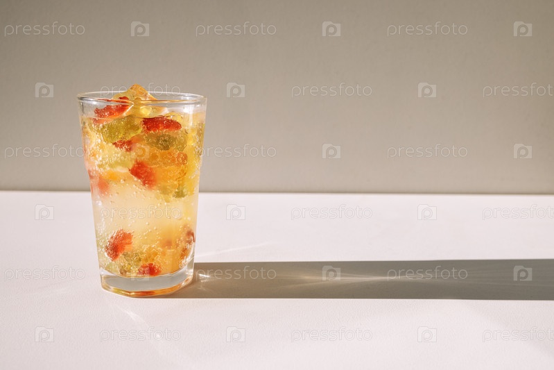 Крупный план стакана минеральной воды с вкусными мармеладными мишками и кубиками льда на белом столе. Чашка прохладного, яркого, вкусного сладкого напитка на светлом фоне