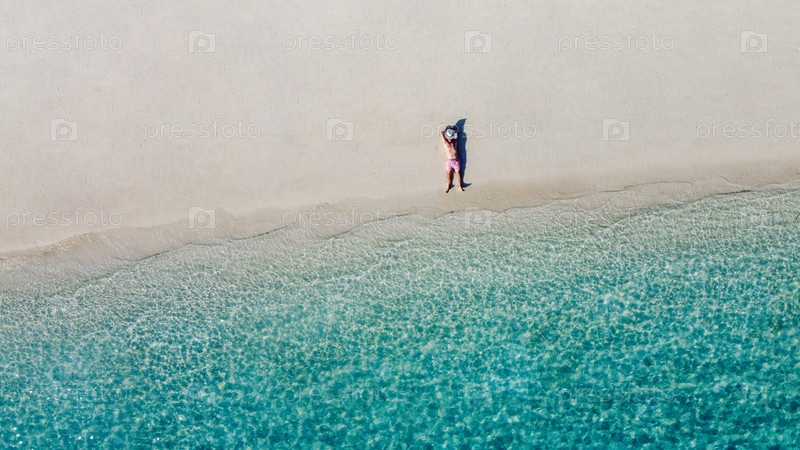 Вид сверху на молодого человека в белой шляпе на берегу океана
