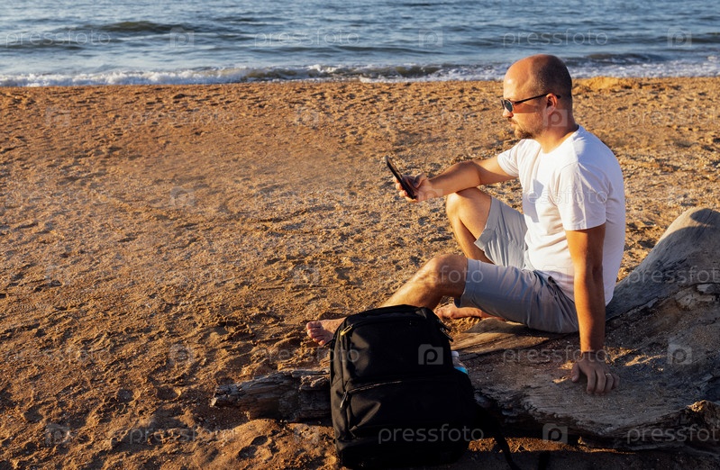 Молодой человек держит телефон у моря. Мужчина средних лет в солнцезащитных очках смотрит в свой мобильный телефон и отдыхает на песчаном пляже