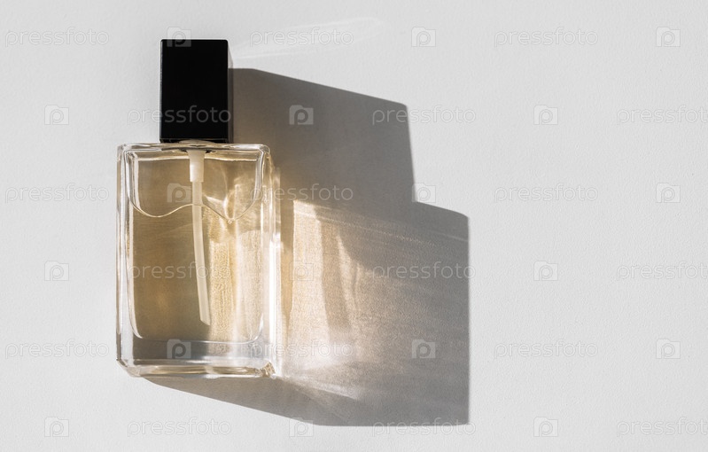 Крупный план прозрачного стеклянного флакона для духов с черной крышкой. Макет флакона с ароматной водой на белом фоне. Косметические продукты. Яркий солнечный свет