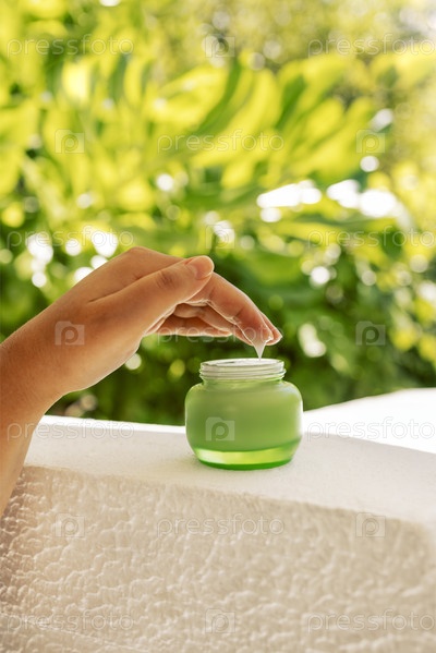 Крупный план женской руки с белым увлажняющим кремом на пальцах и зеленой баночкой
