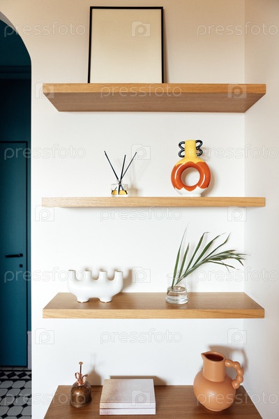 Детали стильного интерьера дома крупным планом. Деревянные полки с вазами и кувшинами ручной работы, макет рамки для плаката, книги и ароматические палочки