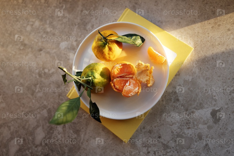 Крупный план сочных мандаринов на керамической тарелке. Желтая книга и вкусные ароматные оранжевые фрукты на мраморном столе. Здоровая и вкусная еда. Красивый солнечный свет