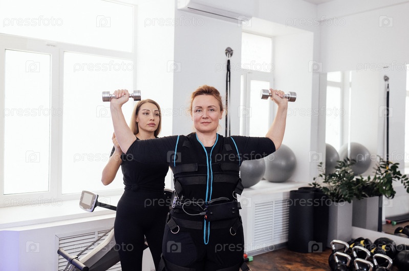 Женщина среднего возраста в костюме для электростимуляции мышц занимается физической активностью с персональным тренером