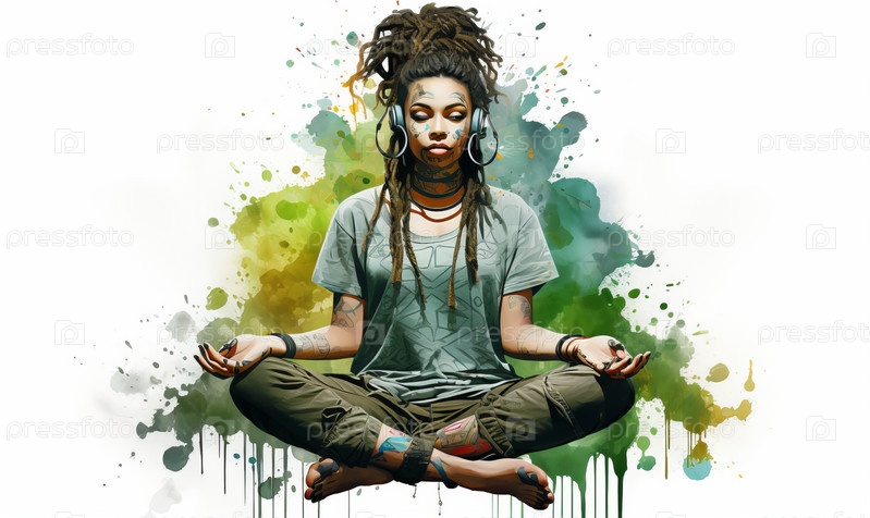 Рисунок медитирующей девушки в зеленом на белом фоне