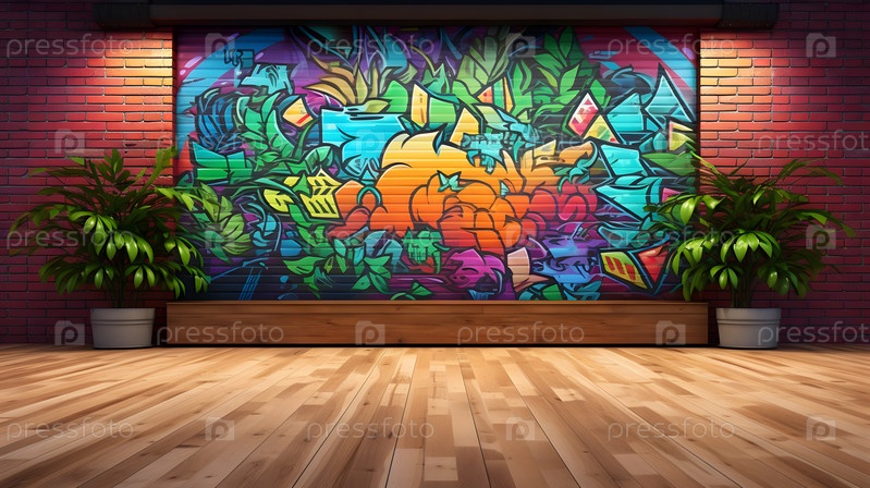Цветы в горшке на фоне красочного граффити на стене