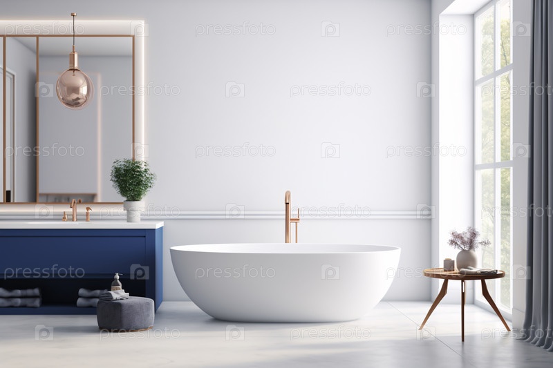 Современный интерьер ванной комнаты со стенами в сине-белых тонах, бетонным полом, деревянной тумбой с черной раковиной и овальным зеркалом, белой ванной, панорамными окнами