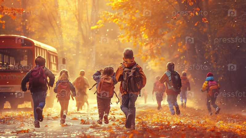 Дети бегут к школьному автобусу осенним утром с рюкзаками