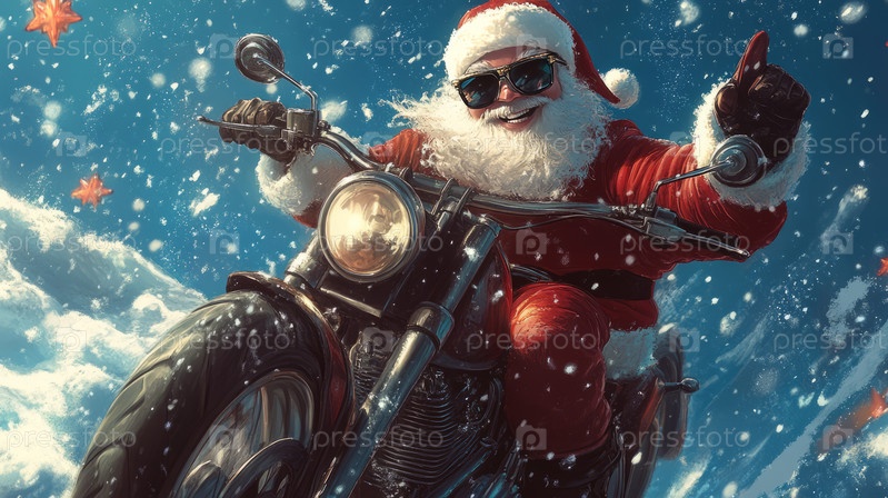 Санта едет на мотоцикле по заснеженному лесу, привнося праздничное настроение с уникальной изюминкой