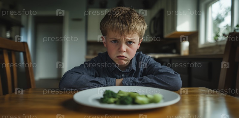 Ребенок не хочет есть овощи на деревянном столе в уютной кухне