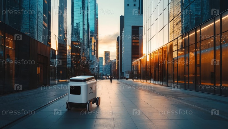 Автономный робот-доставщик пробирается по современному городскому ландшафту на закате