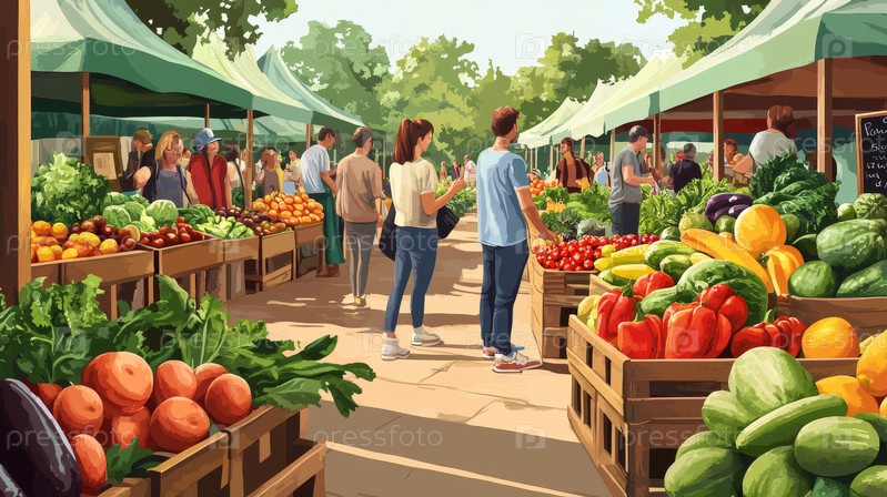 Оживленный фермерский рынок, полный свежих продуктов и жаждущих покупателей