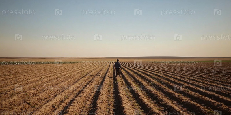Одинокий фермер шагает по бескрайнему полю под огромным ясным небом, олицетворяя суть сельской жизни, самоотверженный труд и красоту природного ландшафта