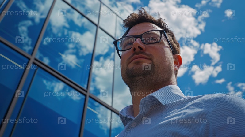 Корпоративный сотрудник уверенно стоит перед современным стеклянным зданием