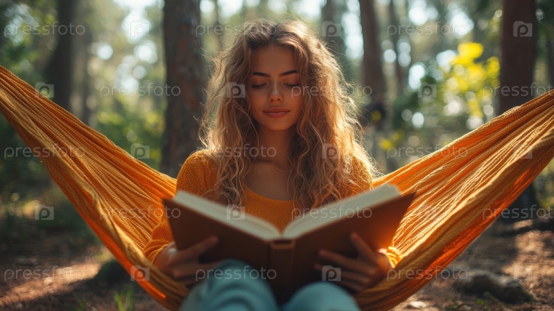 Молодая женщина читает в гамаке в лесу