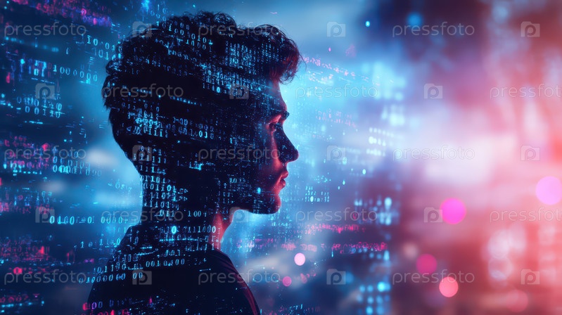 Двойная экспозиция профиля молодого человека в сочетании со светящимися цифровыми кодовыми узорами в ярких розовых и голубых тонах, символизирующими технологии, данные и цифровую идентификацию