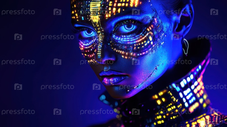 Женщина-киберпанк с неоновыми лицевыми имплантатами