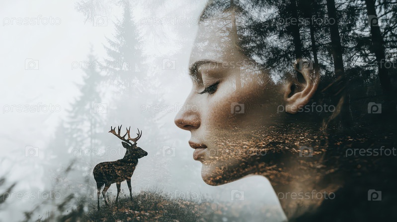 Мечтательная двойная экспозиция, сочетающая в себе безмятежный профиль женщины с золотым лесом и одиноким оленем в тумане, пробуждает гармонию с природой и спокойствие