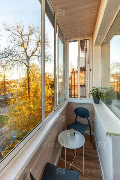 Уютный балкон со стульями и столом с видом на деревья