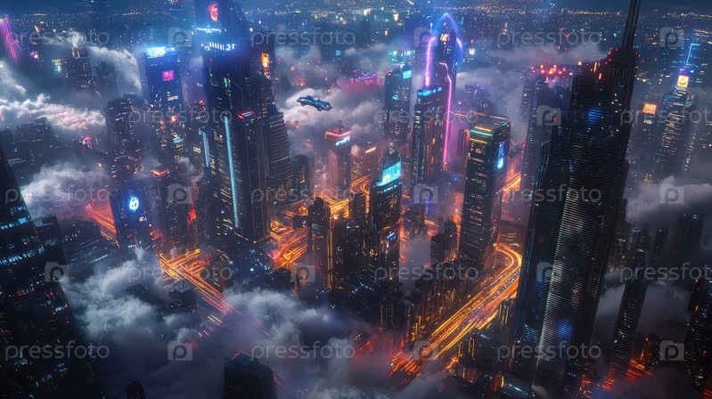 Футуристический киберпанк-город с неоновыми огнями и летающими транспортными средствами