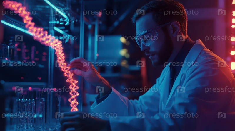 Ученый в лаборатории манипулирует визуализацией цепей ДНК