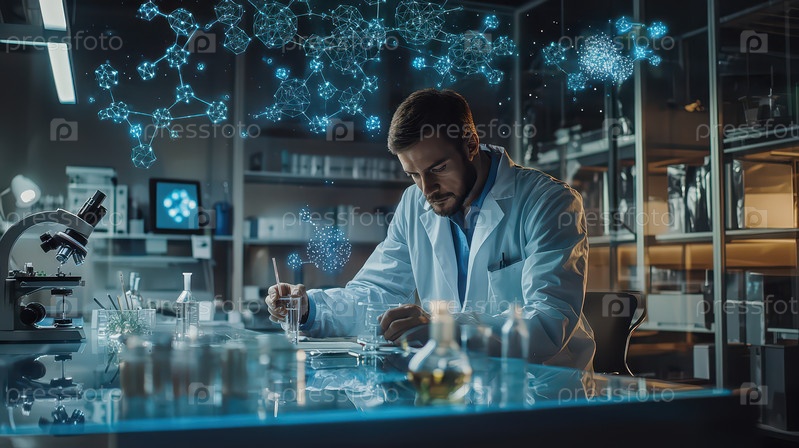 Мужчина-ученый, работающий с молекулярными данными в лаборатории