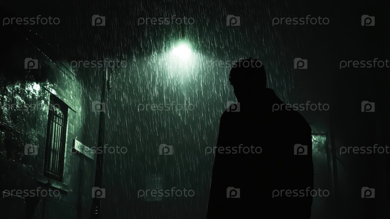 Таинственная фигура на улице в дождливую ночь под уличным фонарем