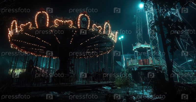 Заброшенная карусель и колесо обозрения ночью под дождем