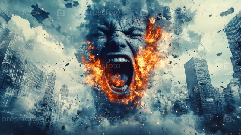 Кричащее лицо на фоне взрывного разрушения