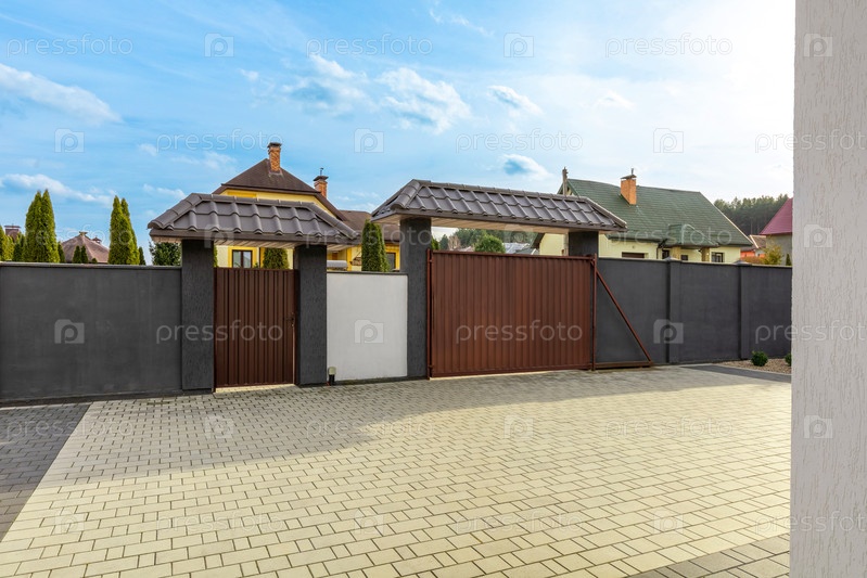 Современные ворота дома с кирпичным и металлическим забором