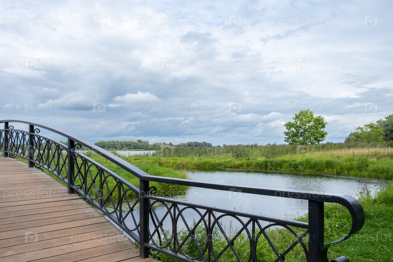 Великий Новгород, Россия - 30.07.24. Живописный деревянный мост через ручей. Музей-заповедник «Витославлицы»