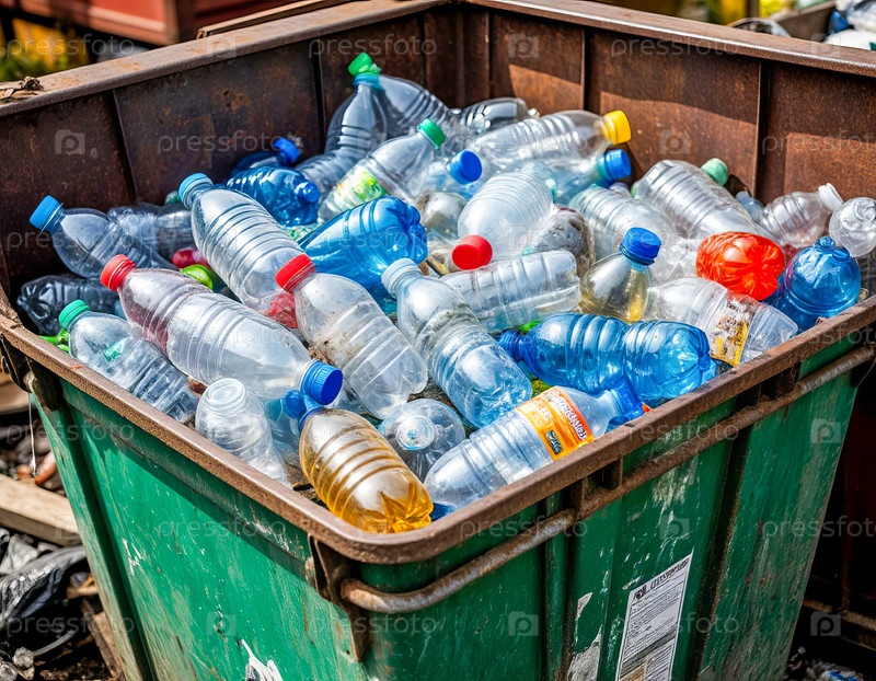 Переполненный мусорный бак с пластиковыми бутылками