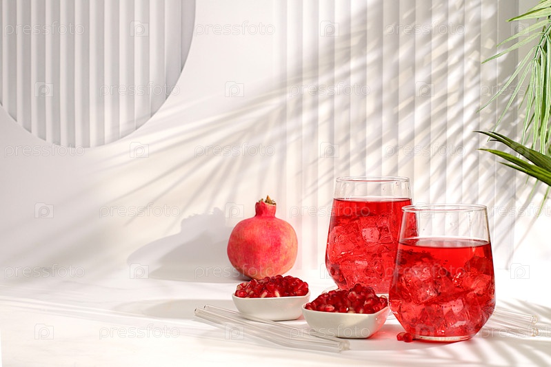 Фруктовый сок и ингредиенты, летний напиток или тоник с гранатом и льдом на ярком столе, диета детоксикации и концепция потери веса, здоровая и натуральная пища, источник витамина С, селективный фокус