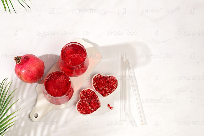 Фруктовый гранатовый сок и ингредиенты, летний гранатовый напиток на ярком столе, детокс-диета и концепция потери веса, здоровая и натуральная пища, источник витамина С, селективный фокус, место для текста