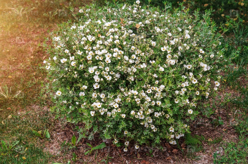 Лапчатка (Potentilla) в виде шара цветет белыми цветами